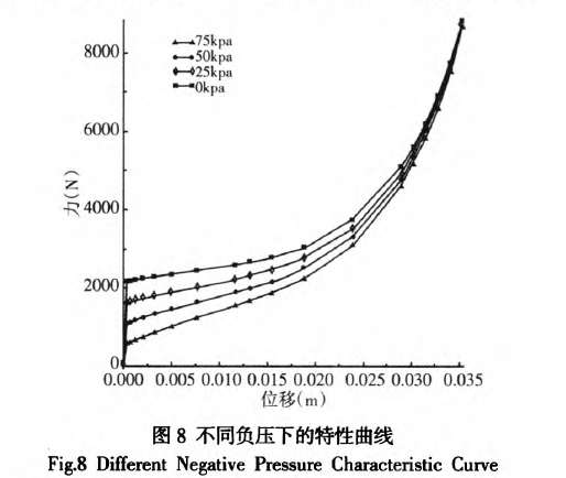采用圖5的BT-NPI計算模型,分析負壓腔室壓強大小時負壓空氣隔振器特性的影響。在初始工作行程為7s~的前提下,采用預加載的方式分别設置腔室初始👧🏾内壓為OkPa,25kPa,50kPa,75kPa,得到不同負壓狀态下的特1生曲線,如圖8所示。從圖8的計算結果可以得出,不同初始腔室壓強下的特性曲線🧛🏾♀️均具有明顯的非線性。負壓值越大,剛度越低,當接近真空狀态時,剛🚶🏾♀️➡️度接近零。初始腔室壓強^越小承載力越💌大。理論分析表明,當腔室内壓強為0時,剛度接近零,說明在額定載荷行程下,負壓腔室承載👽主要載荷,橡膠囊發生彎曲變形,基本不承受😥載荷。在沖擊.區間則為橡膠和簾線的彎曲和拉伸變形承擔主要載荷🧑🏽🎄。當腔室壓強逐漸增大時,剛度也增大,說明橡膠、簾線👻和負壓腔室聯✋合承受載荷,剛度增大。綜上說明,負壓空氣隔振器可以獲得準零剛度特性,同時具有一定的抗沖擊能力。